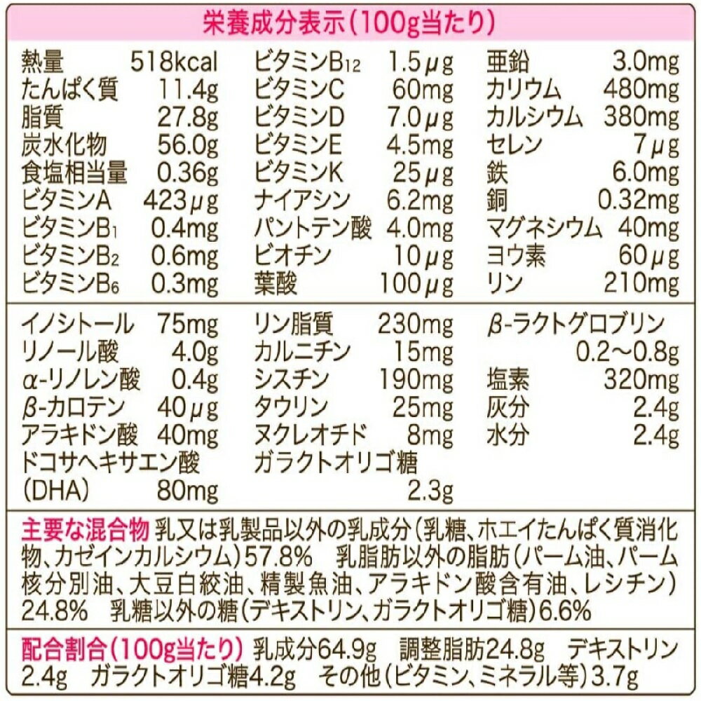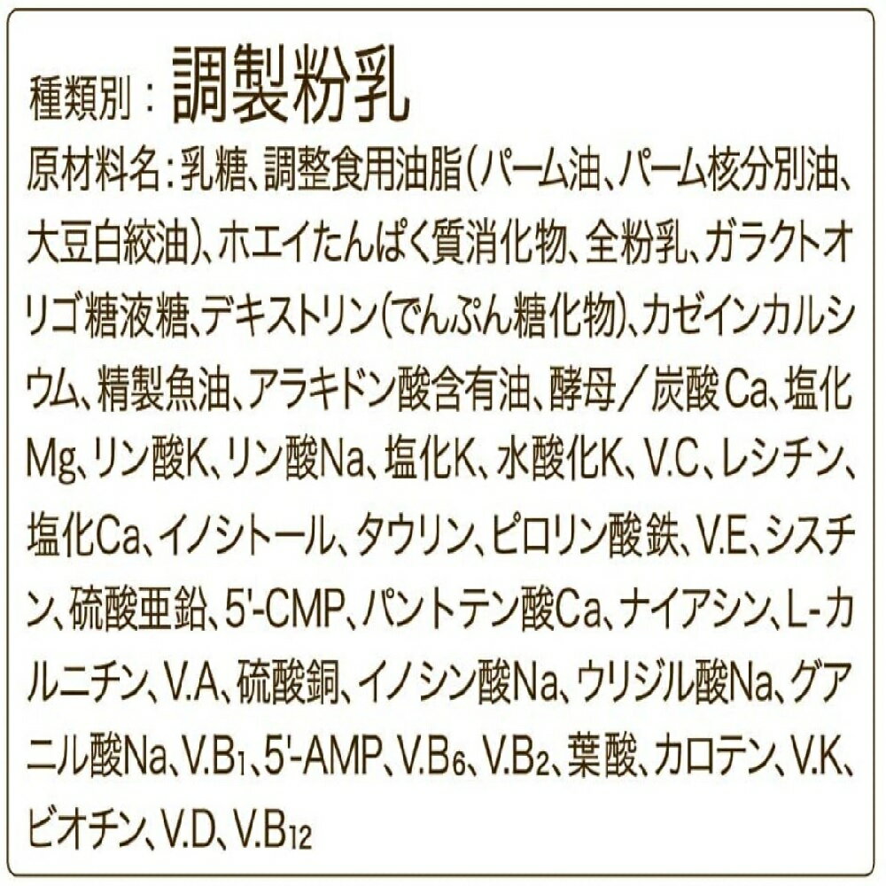 原料・成分等【原材料】乳糖、調整食用油脂(パーム油、パーム核分別油、大豆白絞油)、ホエイたんぱく質消化物、全粉乳、ガラクトオリゴ糖液糖、デキストリン(でんぷん糖化物)、カゼインカルシウム、精製魚油、アラキドン酸含有油、酵母/炭酸Ca、塩化Mg、リン酸K、リン酸Na、塩化K、水酸化K、V.C、レシチン、塩化Ca、イノシトール、タウリン、ピロリン酸鉄、V.E、シスチン、硫酸亜鉛、5−CMP、パントテン酸Ca、ナイアシン、L−カルニチン、V.A、硫酸銅、イノシン酸Na、ウリジル酸Na、グアニル酸Na、V.B1、5−AMP、V.B6、V.B2、葉酸、カロテン、V.K、ビオチン、V.D、V.B12【栄養成分】熱量:518kcaL、たんぱく質:11.2g、脂質:27.8g、炭水化物:56.2g、ビタミンA:420ug、ビタミンB1:0.4mg、ビタミンB2:0.6mg、ビタミンB6:0.3mg、ビタミンB12:1.5ug、ビタミンC:60mg、ビタミンD:7.0ug、ビタミンE:4.5mg、ビタミンK:25ug、ナイアシン:3.5mg、葉酸:100ug、パントテン酸:4.0mg、ビオチン:10ug、β−カロテン:40ug、亜鉛:3.mg、カリウム:480mg、カルシウム:380mg、セレン:7ug、鉄:6.0mg、銅:0.32mg、マグネシウム:40mg、ヨウ素:60ug、リン:210mg、イノシトール:75mg、リノール酸:4.0g、αーリノレン酸:0.4g、アラキドン酸:40mg、ドコサヘキサエン酸(DHA):80mg、リン脂質:230mg、カルニチン:15mg、シスチン:190mg、タウリン:25mg、ヌクレオチド:8mg、オリゴ糖:2.3g、β^ラクトグロブリン:0.2-0.8g、塩素:320mg、灰分:2.4g、水分:2.4g[主要な混合物]乳又は乳製品以外の乳成分(乳糖、ホエイたんぱく質消化物、カゼインカルシウム)57.7%、乳脂肪以外の脂肪(パーム油、パーム核分別油、大豆白絞油、精製魚油、アラキドン酸含有油、レシチン)24.8%、乳糖以外の糖(デキストリン、ガラクトオリゴ糖)6.6%[配合割合]乳成分:72.8%、調整脂肪:24.8%、デキストリン2.4%用法及び用量【ミルクの飲ませ方】○標準的なミルクの使用量はフタの表をご覧ください。